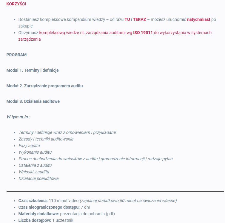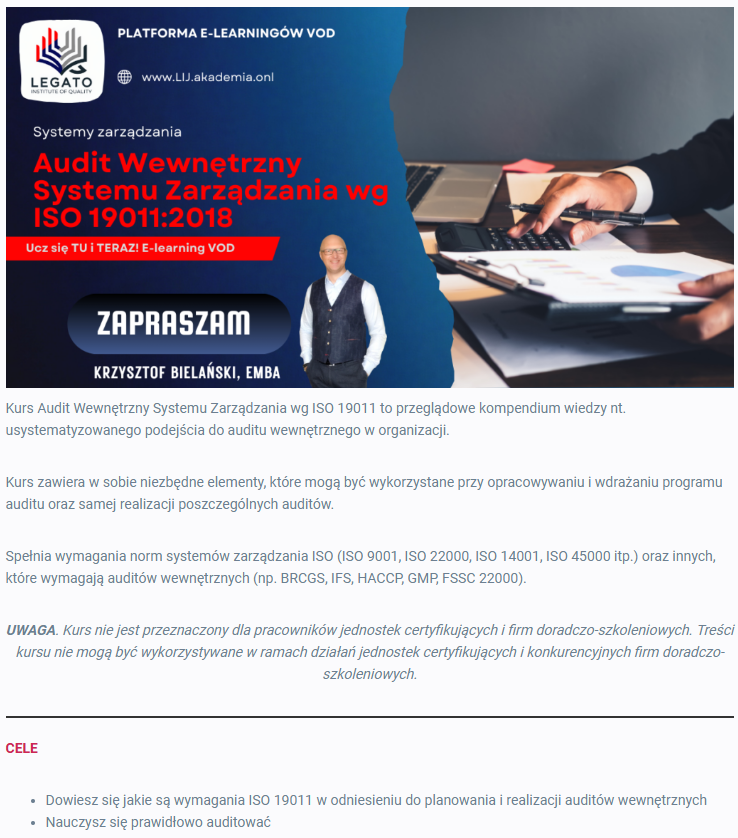 Audit (Audyt) Wewnętrzny Systemu Zarządzania wg ISO 19011:2018 (e-learning VOD)