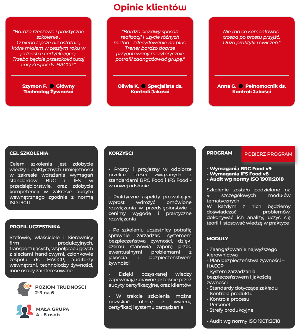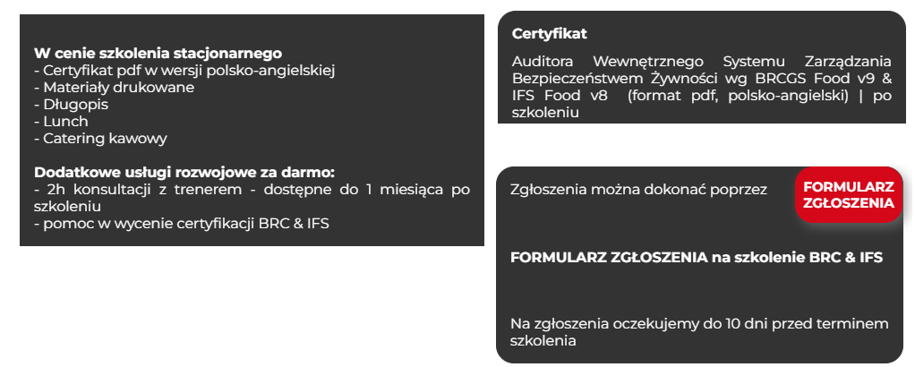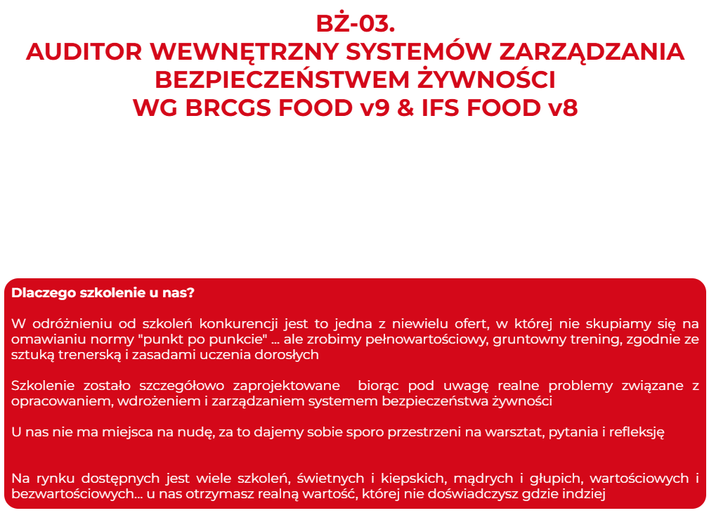 AUDITOR (AUDYTOR) WEWNĘTRZNY BEZPIECZEŃSTWA ŻYWNOŚCI WG BRC FOOD v9 & IFS FOOD v8