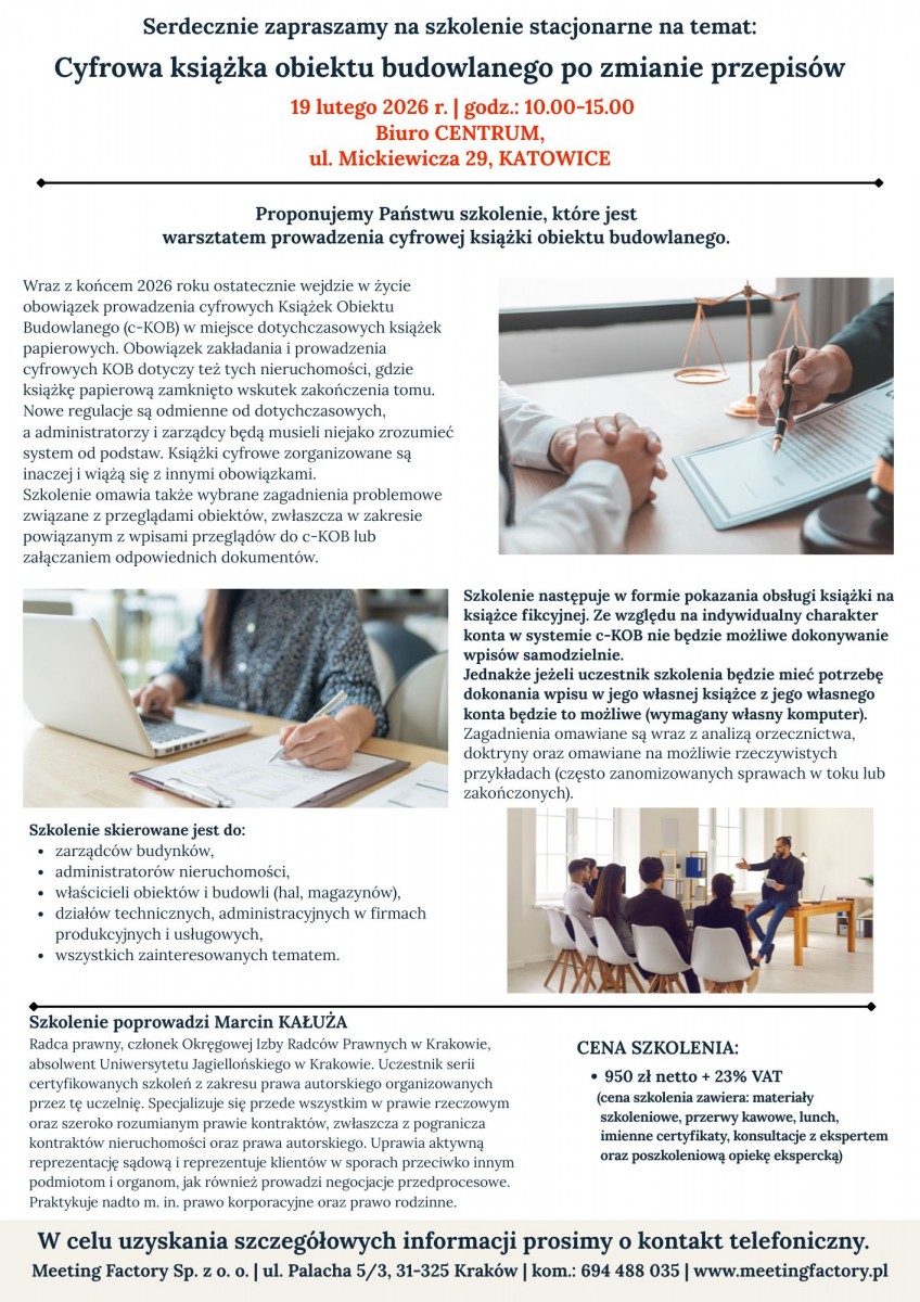 Radca prawny, członek Okręgowej Izby Radców Prawnych w Krakowie, absolwent Uniwersytetu Jagiellońskiego w Krakowie. Prowadzi obsługę prawną wspólnot mieszkaniowych oraz obsługę inwestycji. Jego dalsza specjalizacja to przede wszystkim prawo rzeczowe oraz szeroko rozumiany obrót nieruchomościami, w szczególności w zakresie umów, regulacji stanów prawnych nieruchomości, sprzedaży, najmu, dzierżawy i innych czynności prawnych oraz faktycznych związanych z obrotem nieruchomościami, reprezentacją firm deweloperskich przed sądami, klientami i organami administracji publicznej, w tym również obsługą prawną zagranicznych inwestorów