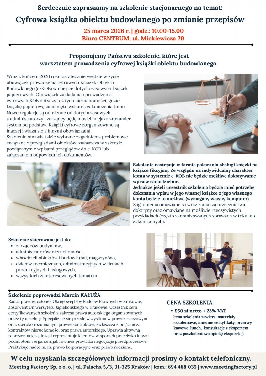 Radca prawny, członek Okręgowej Izby Radców Prawnych w Krakowie, absolwent Uniwersytetu Jagiellońskiego w Krakowie. Prowadzi obsługę prawną wspólnot mieszkaniowych oraz obsługę inwestycji. Jego dalsza specjalizacja to przede wszystkim prawo rzeczowe oraz szeroko rozumiany obrót nieruchomościami, w szczególności w zakresie umów, regulacji stanów prawnych nieruchomości, sprzedaży, najmu, dzierżawy i innych czynności prawnych oraz faktycznych związanych z obrotem nieruchomościami, reprezentacją firm deweloperskich przed sądami, klientami i organami administracji publicznej, w tym również obsługą prawną zagranicznych inwestorów