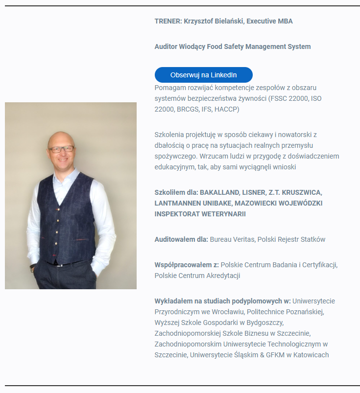 CZŁONEK ZESPOŁU DS. BEZPIECZEŃSTWA ŻYWNOŚCI (HACCP). (PAKIET e-learningów VOD)