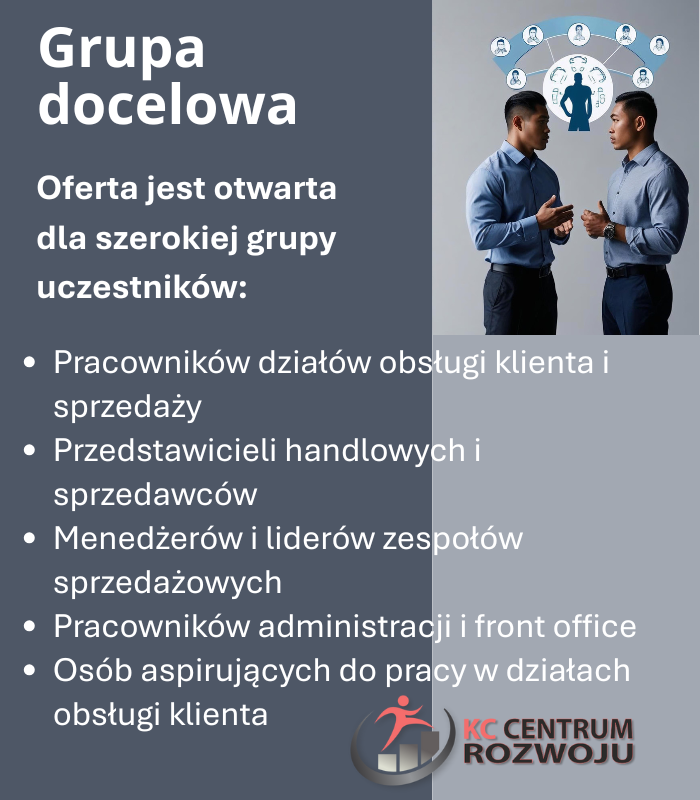 Szkolenie jest skierowane do osób, które chcą doskonalić swoje umiejętności w zakresie obsługi klienta, komunikacji oraz radzenia sobie z trudnymi sytuacjami w relacjach z klientami. Oferta jest otwarta dla szerokiej grupy uczestników, w tym m.in.: