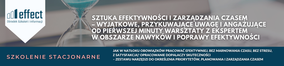 Podczas szkolenia sztuka efektywności i zarządzania czasem uczestnicy dokonają diagnozy własnej skuteczności w realizacji zadań, poznają praktyczne reguły planowania, porządkowania oraz wartościowania zadań zawodowych w celu efektywnego wykorzystania posiadanego czasu. Poznają skuteczne zasady ułatwiające pracę w mniejszym stresie. Nauczą się zarządzania czasem, planowania działania, wyeliminują pożeracze czasu, dowiedzą się co to prokrastynacja i jak ją pokonać.