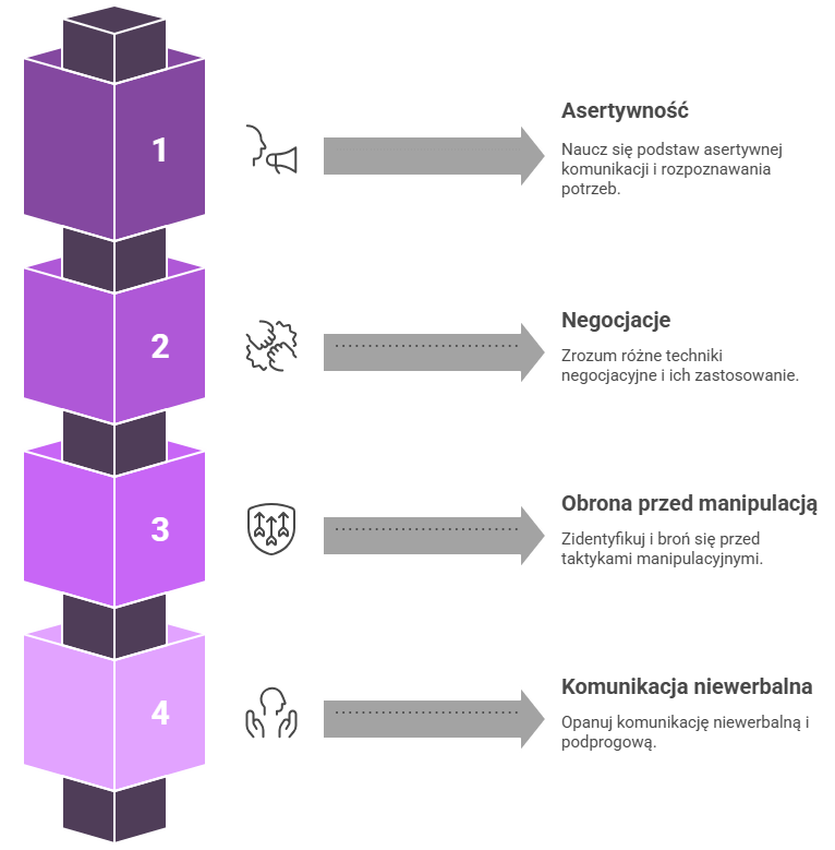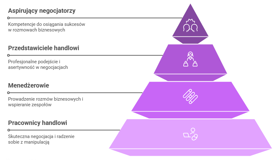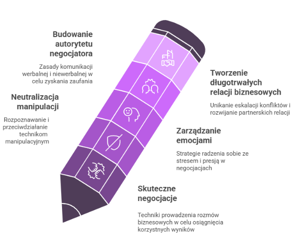 Dzięki połączeniu teorii z praktyką uczestnicy nauczą się rozpoznawać i neutralizować manipulacyjne techniki rozmówców, prowadzić rozmowy biznesowe z większą pewnością siebie oraz zarządzać emocjami w trudnych sytuacjach. Warsztaty kładą nacisk na praktyczne zastosowanie zdobytej wiedzy, pozwalając uczestnikom od razu wdrożyć nowe umiejętności w swojej codziennej pracy.