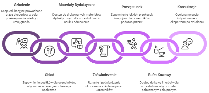 szkolenie, obiad, indywidualne drukowane materiały dydaktyczne, imienne zaświadczenie o ukończeniu szkolenia, poczęstunek, bufet kawowy, opcjonalnie- indywidualne konsultacje po zakończeniu szkolenia