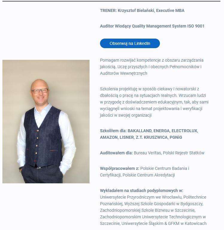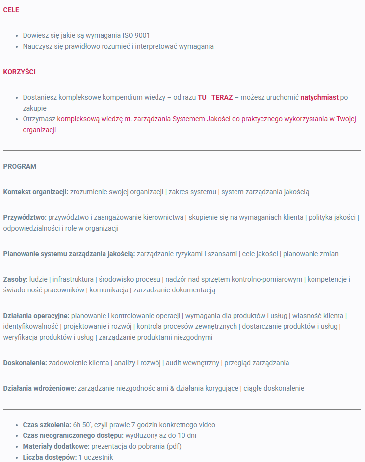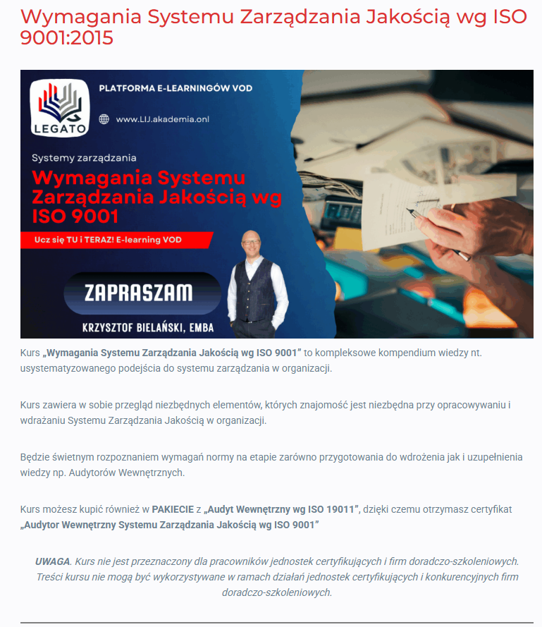 Wymagania Systemu Zarządzania Jakością wg ISO 9001:2015 (e-learning VOD)