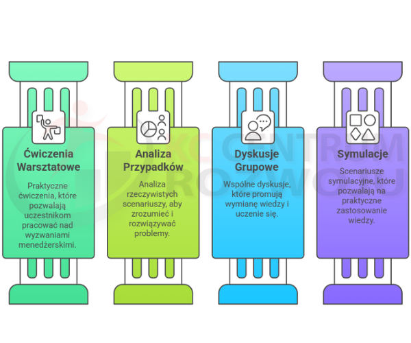 Szkolenie ma charakter warsztatowy i opiera się na praktycznych ćwiczeniach, dyskusjach oraz analizie rzeczywistych przypadków. Uczestnicy pracują nad sytuacjami, z jakimi spotykają się w swojej codziennej pracy zawodowej, dzięki czemu zyskują realne umiejętności w zarządzaniu zespołem. Każdy moduł zawiera ćwiczenia, wspólne dyskusje oraz symulacje, które pozwalają na praktyczne zastosowanie zdobytej wiedzy.