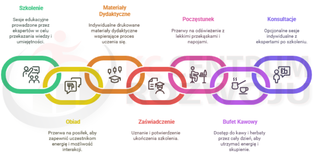 szkolenie, obiad, indywidualne drukowane materiały dydaktyczne, imienne zaświadczenie o ukończeniu szkolenia, poczęstunek, bufet kawowy, opcjonalnie- indywidualne konsultacje po zakończeniu szkolenia